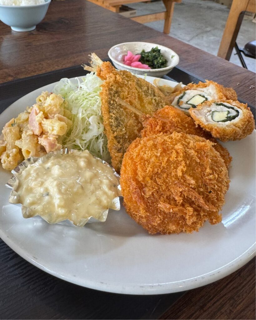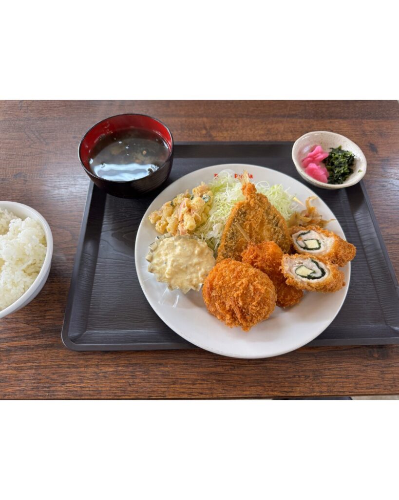 店内で「ミックスフライ定食」を注文して、ご飯は自分でよそうスタイル。