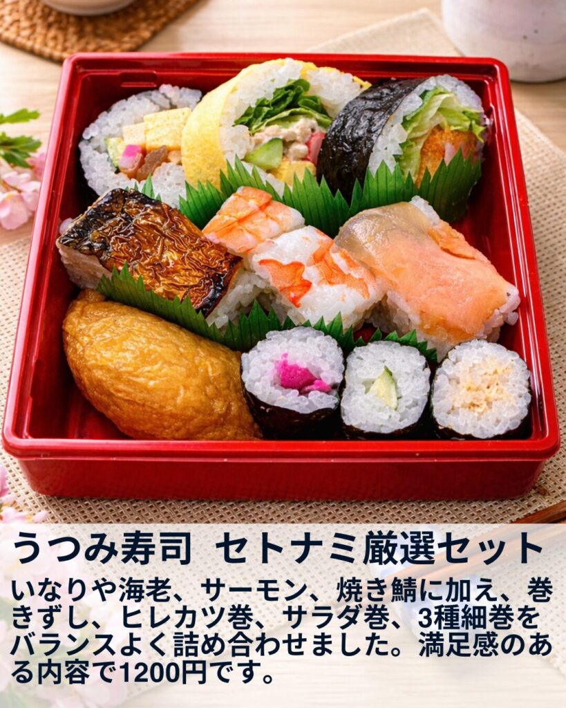 いなりや海老、サーモン、焼き鯖に加え、巻きずし、ヒレカツ巻、サラダ巻、3種細巻をバランスよく詰め合わせました。満足感のある内容で1200円です。