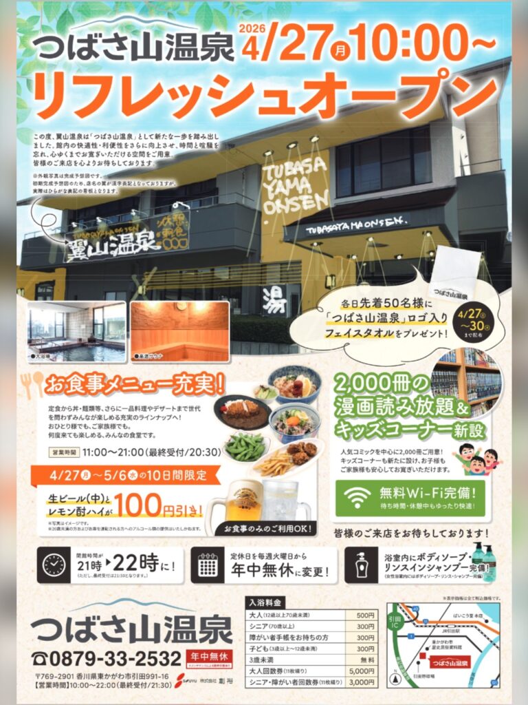 東かがわ市・引田にある「つばさ山温泉」が、2026年4月27日にリフレッシュオープンしました。外観も内観もがらりと生まれ変わり、居心地のよさがぐっと増した印象です。